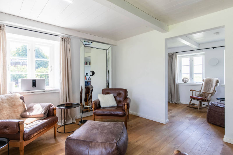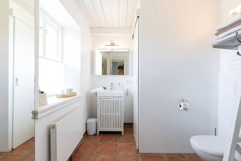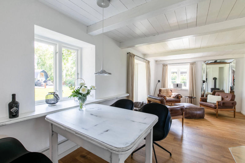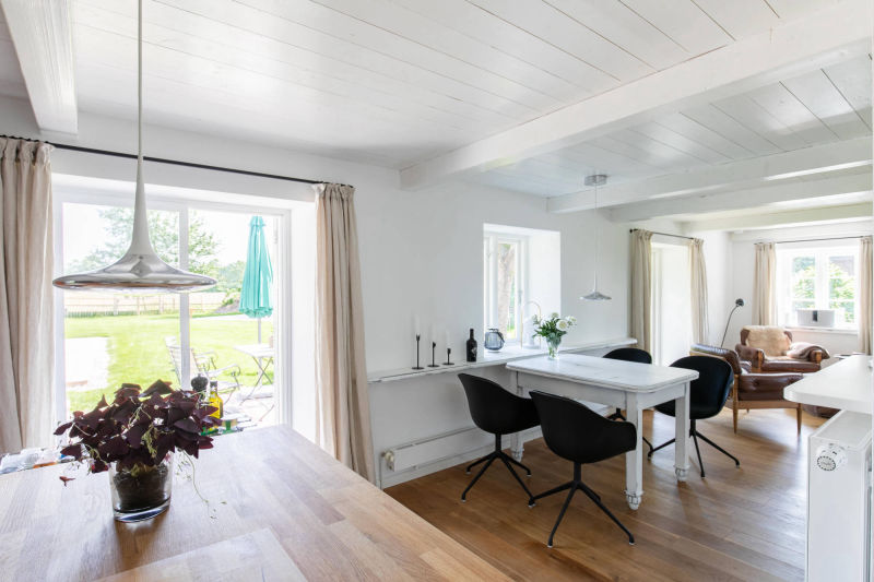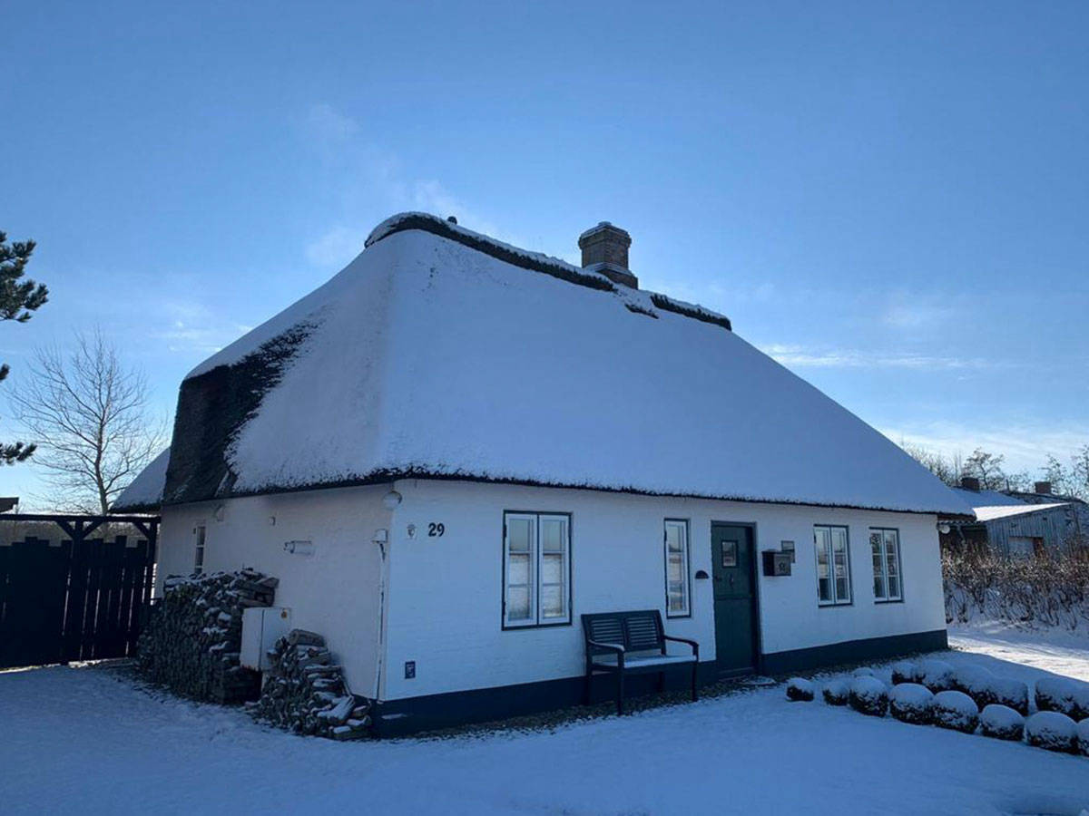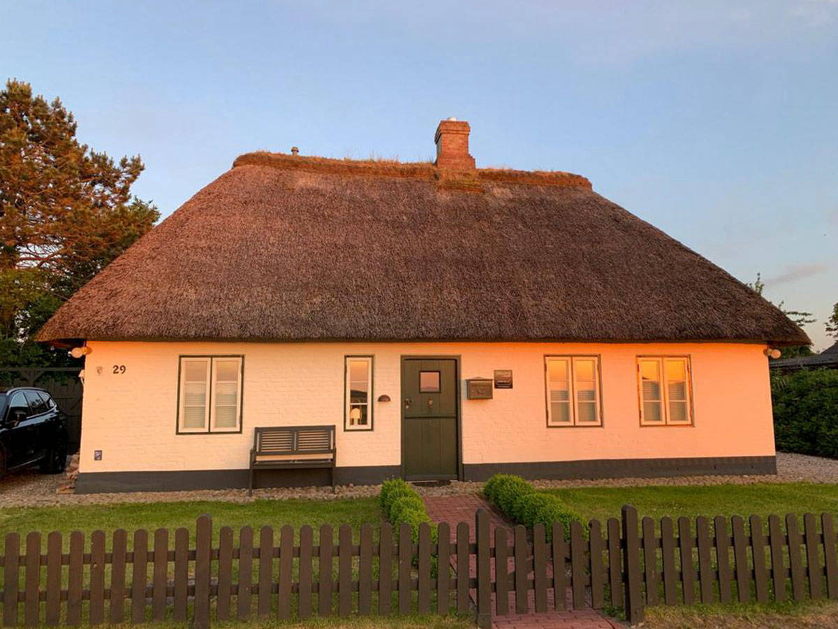 Außen - reetgedeckt, weißes Mauerwerk, dunkelgrüne Eingangstür, weiße Fenster mit dunkelgrünen Blendrahmen. Innen – alle Wände verputzt, Fußböden im Erdgeschoss Eichendielen und Fliesen – Holzdecken mit sichtbarer Balkenlage – kurzum ein echter Traum für 2 (geht auch für 4).