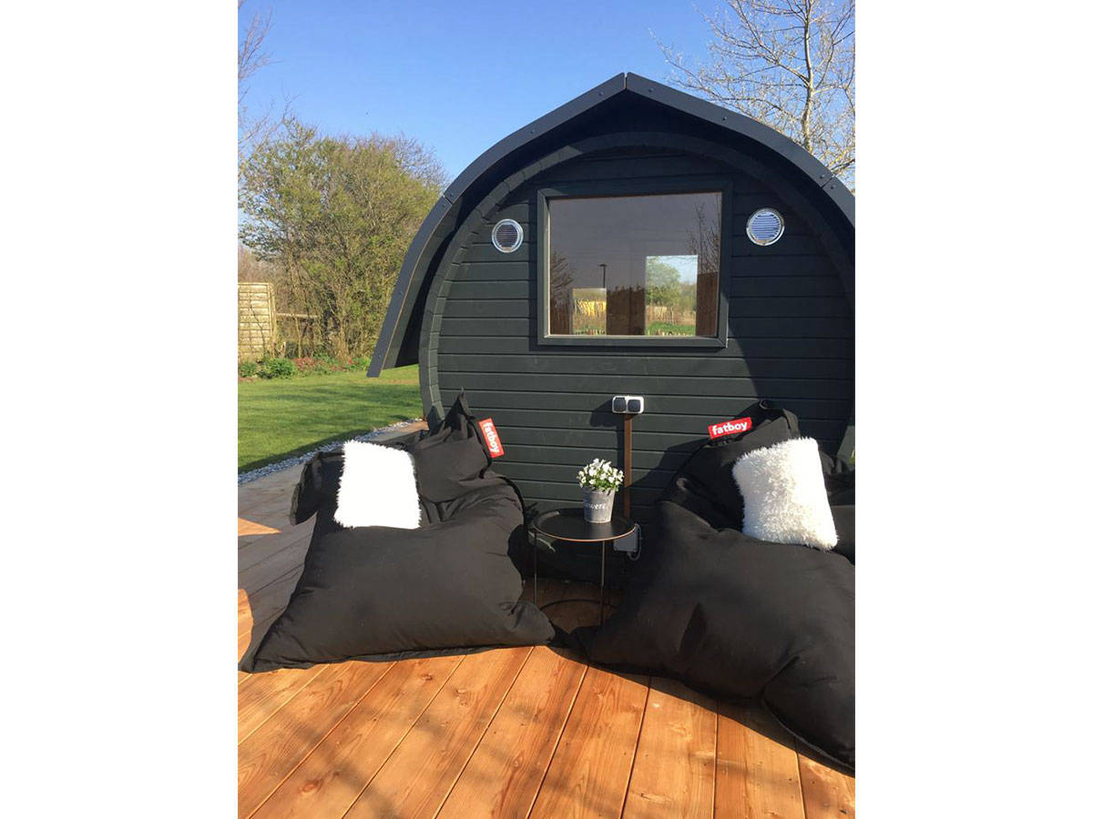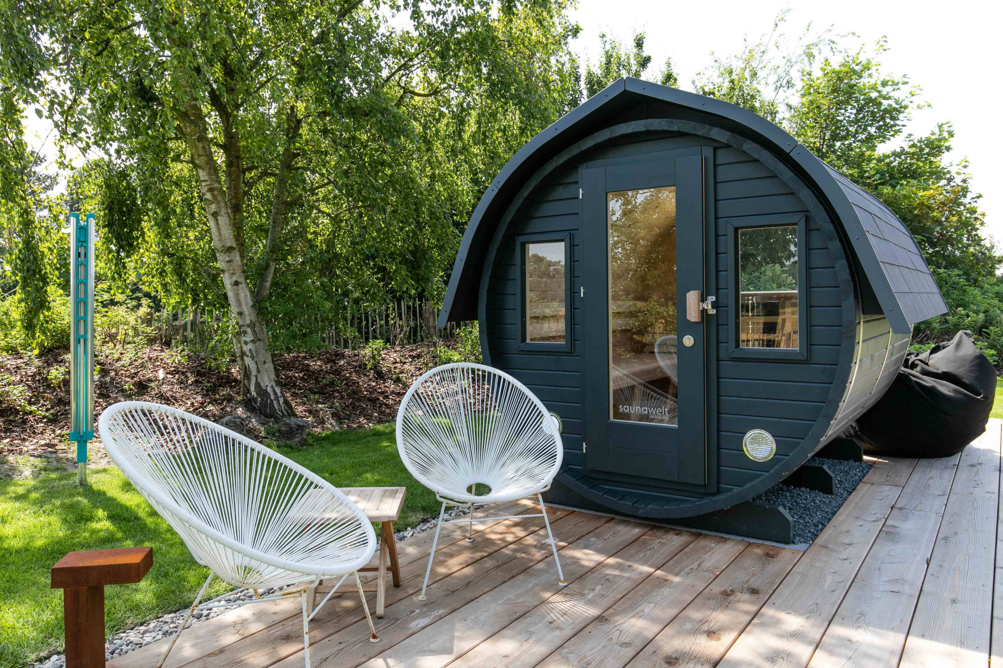 Die Fass-Sauna steht mitten im Garten mit Blick auf die Wiesen und den Tatinger Kirchturm.