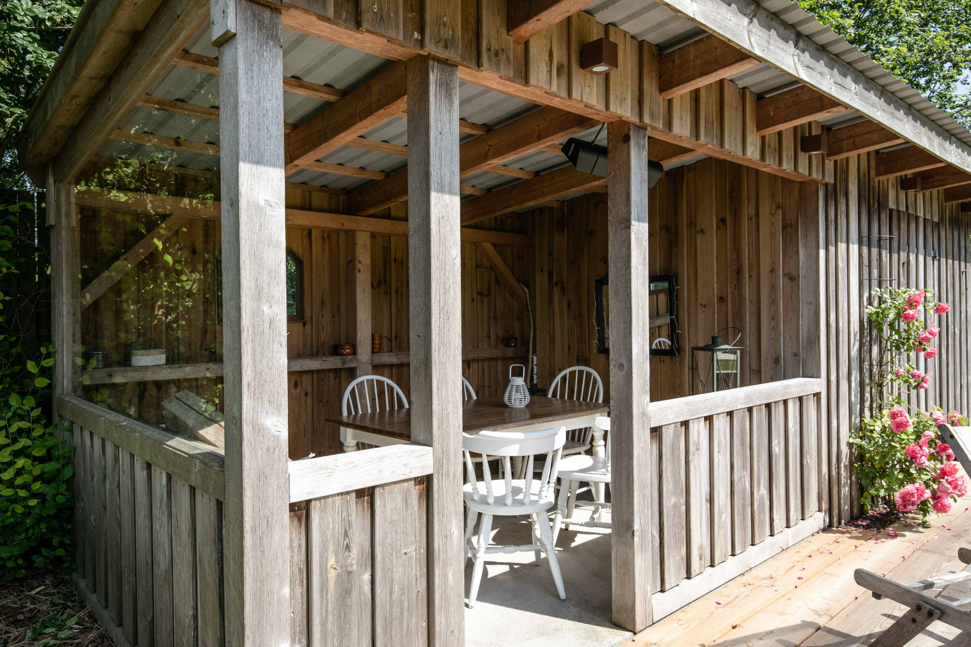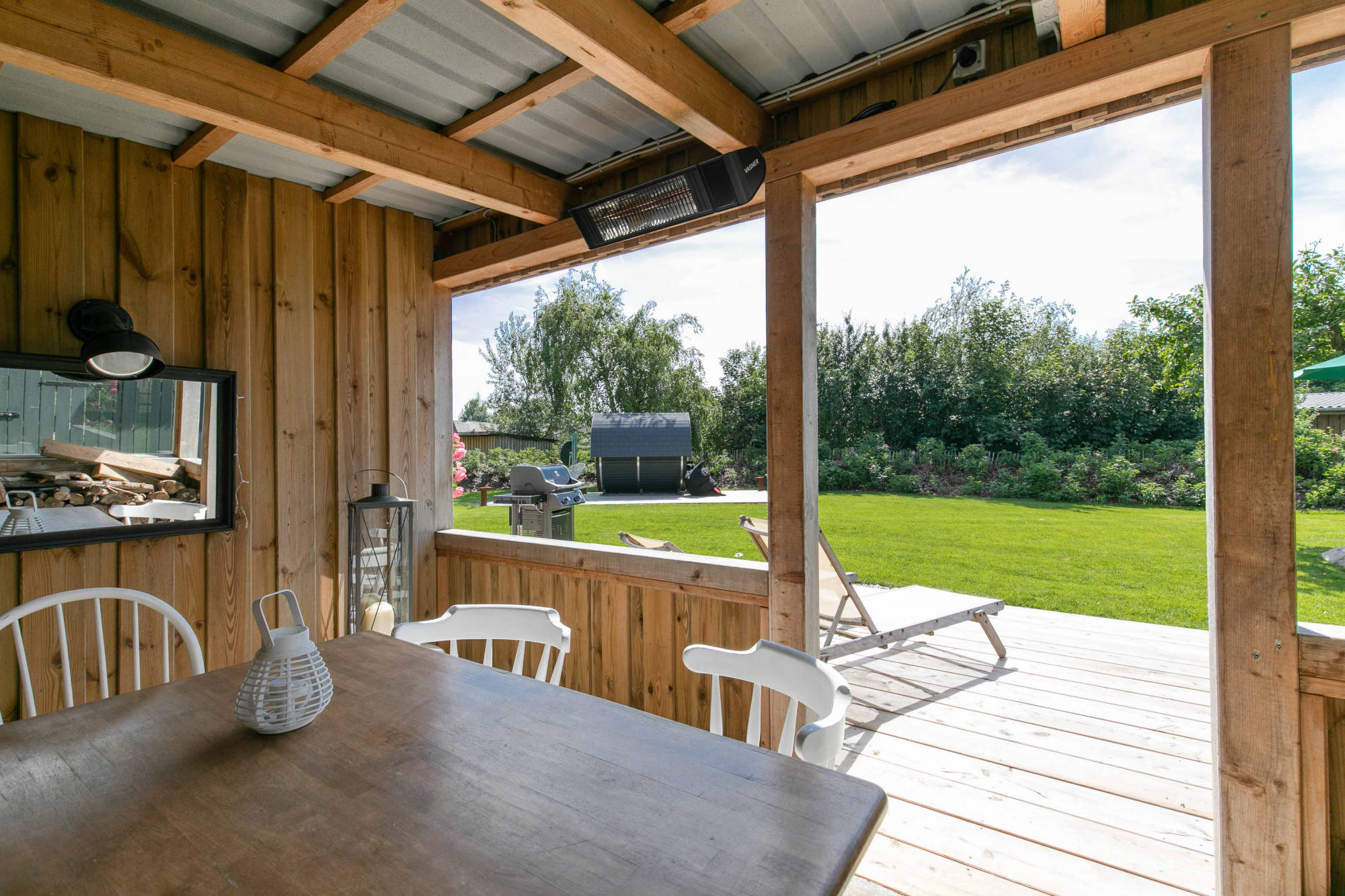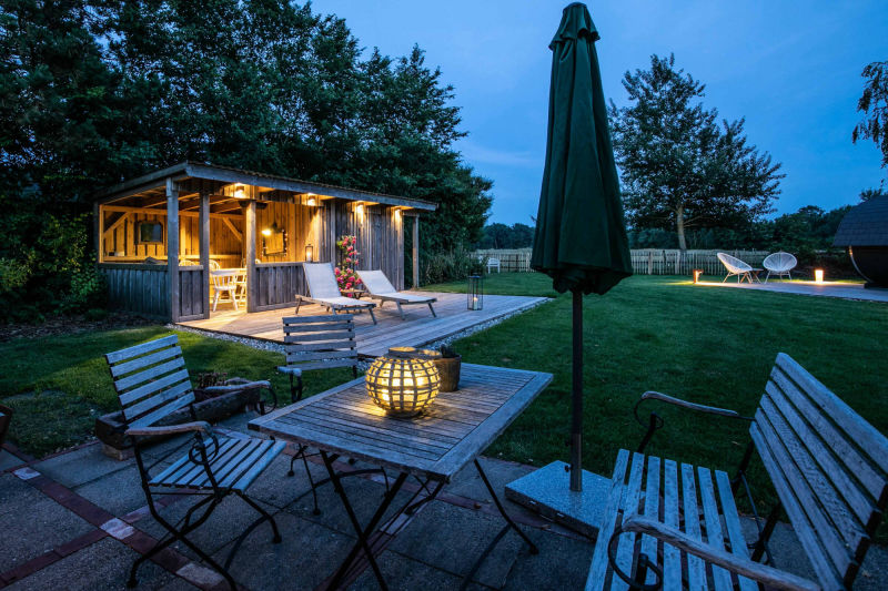 Das Haus hat mehrere nicht überdachte Außen-Terrassen (wenn die Sonne scheint…) und zusätzlich eine mit Dach (falls der Regen mal von der Seite kommt...). Gartentisch, Strandkorb, Liegen, Grill usw. – Jupp ist alles da – läuft…