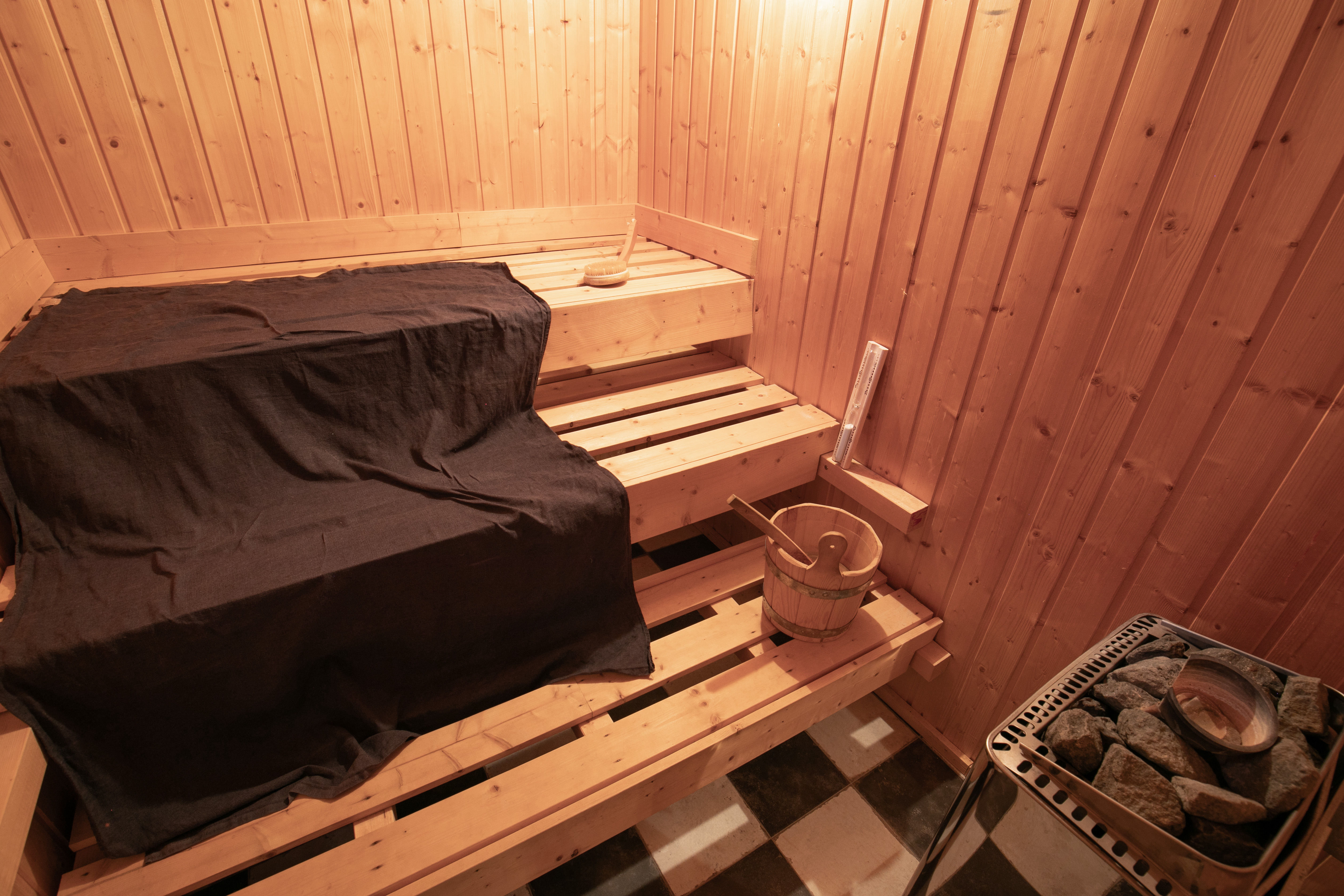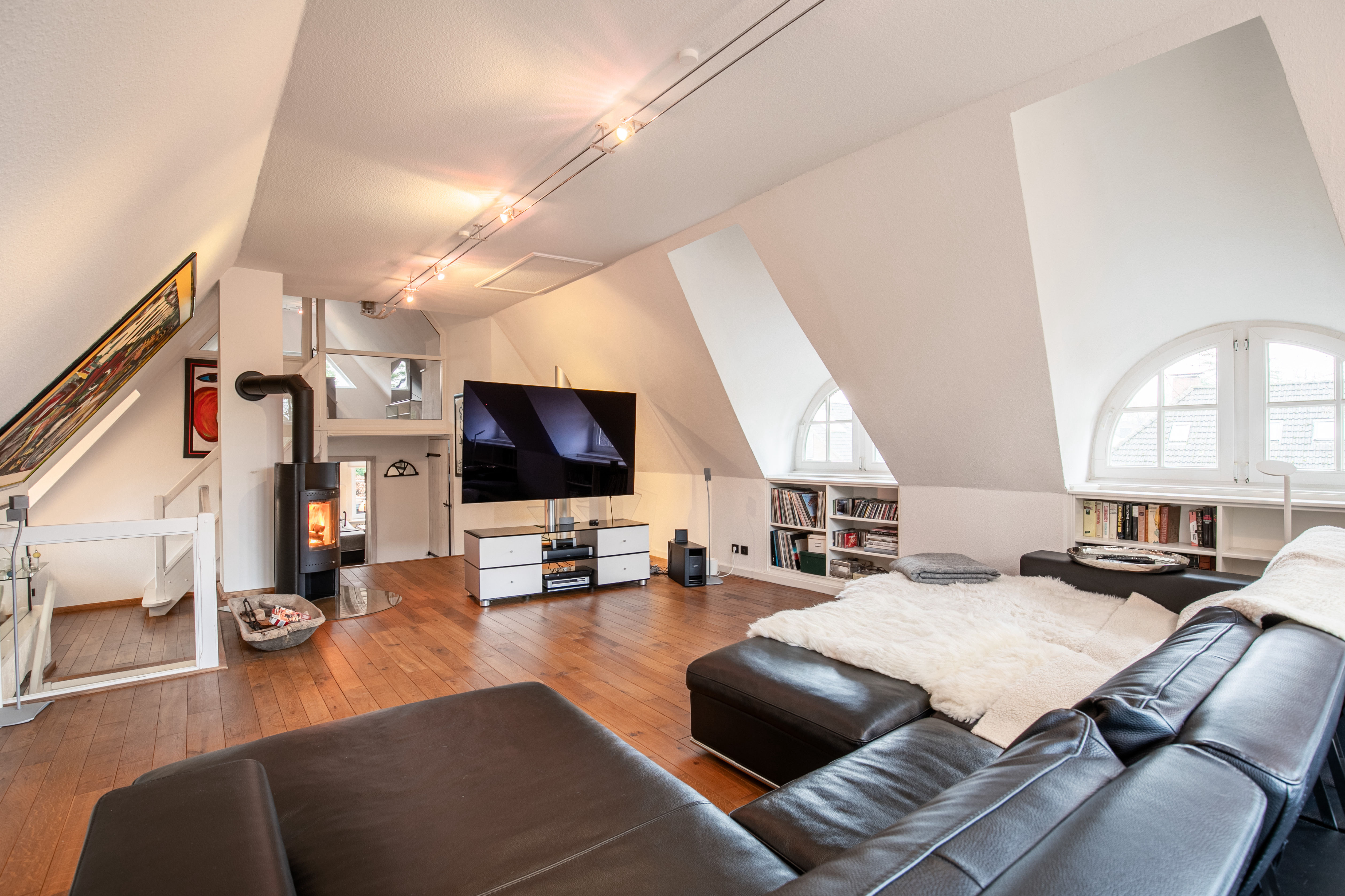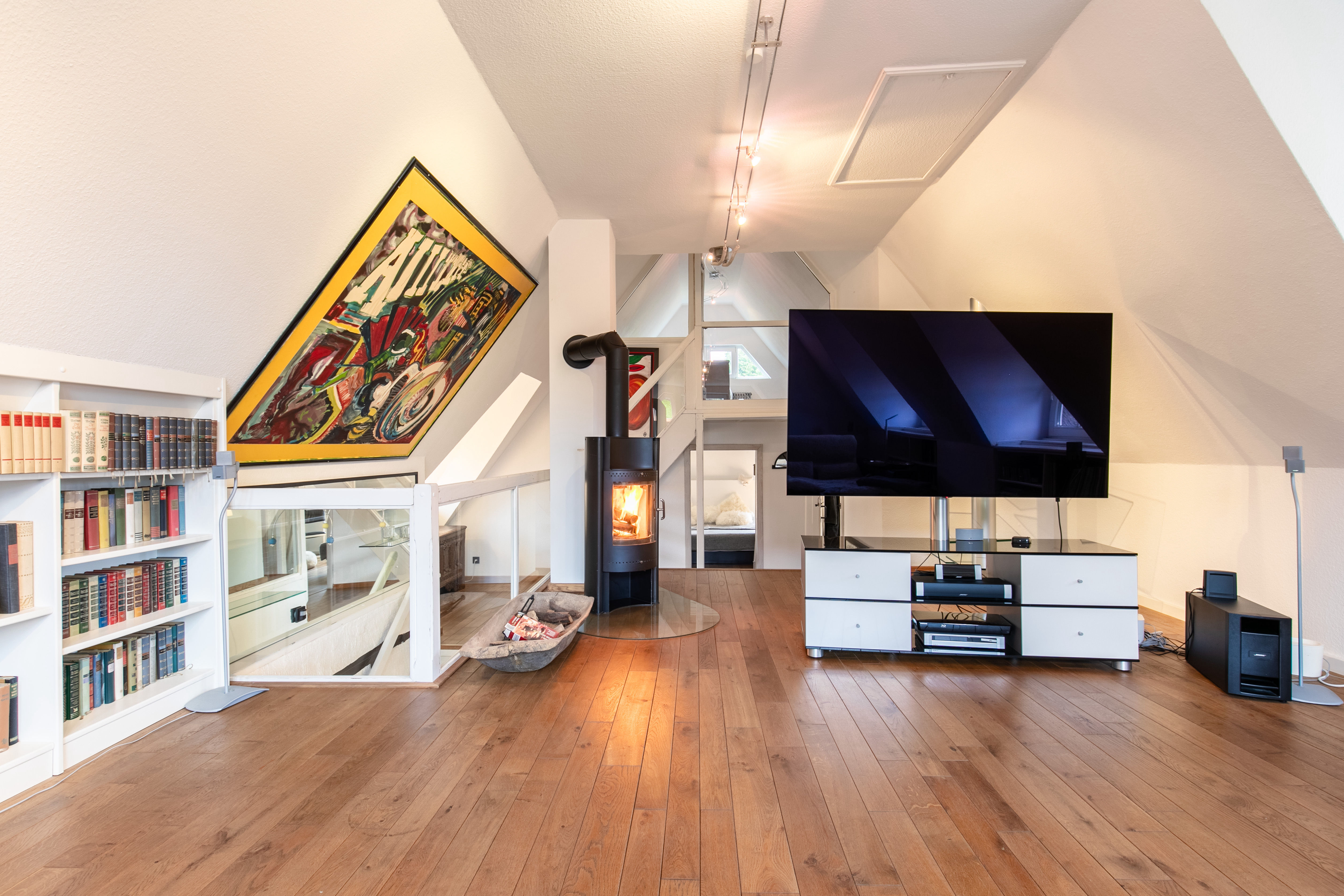 Über den Eingangsbereich gelangen Sie in den großen Essbereich, die „Tenne“ mit der Küche und einem runden Kaminofen. Von hier aus geht's im Erdgeschoss weiter mit 2 Badezimmern (1 davon mit Sauna und 1 davon mit Dampfsauna). Dazu gibt's noch 2 Zimmer (früher Kinderzimmer…) einen Hauswirtschaftsraum und eine Speisekammer. Den Heizungsraum mit einer modernen Gastherme und eigenem Brunnen mit Wasseraufbereitungsanlage gibt's im Haupthaus dazu. Über eine Treppe gelangen Sie ins Dachgeschoss. Dort erwartet Sie der „Living-Room“ mit noch einem Kaminofen, ein weiteres Badezimmer, das Elternschlafzimmer und eine kleine Galerie im Spitzboden- diese „private Area“ wird durch 3 Rund-Gauben und die Giebelfenster lichtgeflutet.